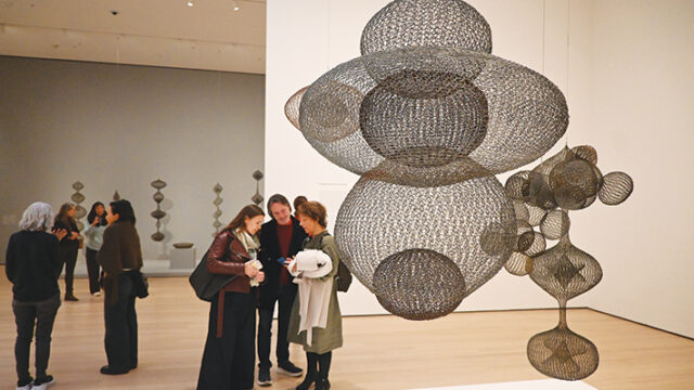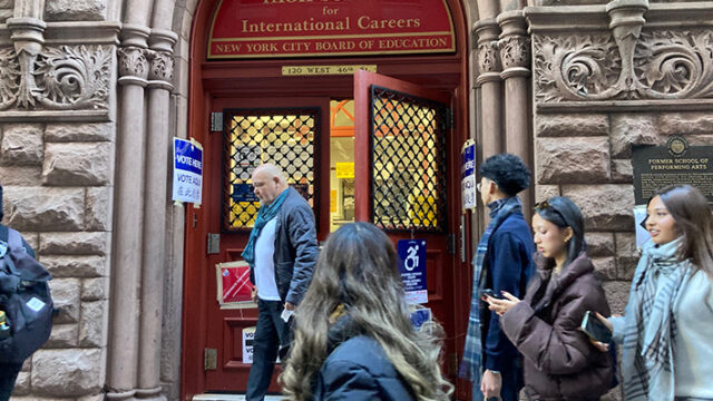 (写真)投票所を出る市民(4日午後1時、マンハッタンの西46丁目の教会特設投票所で、本紙撮影)