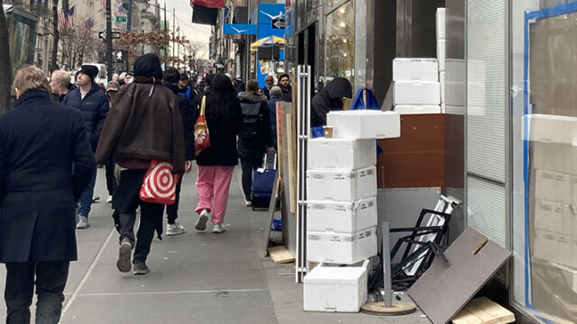 マンハッタンの五番街でも、テナントの入っていないビル入り口前に陣取って空き箱やダンボールで囲った仮説住居で生活しているホームレスがいる。警察の指導を受けて退去するも翌日にはまた元の場所で生活するいたちごっこが続く。街頭の電源コンセントから電気を取って電気ストーブで暖をとり、椅子、電気スタンドまで置いているのはやりすぎだとの批判の声がある一方、食事を提供している市民や観光客もいる。