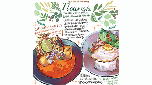 今回紹介するのはタイ料理のNourishです。お花いっぱいの可愛らしい店内はデート向きな風貌ですが、味は至って本格派。いつも地元のお客さんで大賑わいです。昼は明るく、夜はロマンチック。印象がガラッと変わります。ランチメニューを頼んでみて納得、一皿がすごく大きいし、材料もこだわって作っているようでとても本格的な味わい。店員さんの接客も笑顔が多く、気分良くお店を後にしました。アメリカナイズドされたタイ料理に疲れたら行ってみて!