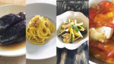 揚げ茄子の煮浸し、大根の皮ときゅうりの漬物、カルボナーラ、チキンのフレッシュトマト煮