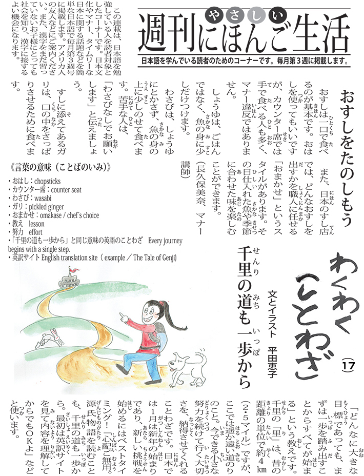 この連載は、日本語を勉強している人を読者対象としたコーナーです。日本文化やマナー、タイムリーな日本に関する話題などを簡単な日本語で毎月第3週号に掲載します。アメリカ人の友人などにご案内ください。また、漢字をまだ習っていないお子様にとっても社会を知り、漢字に接するよい機会になります。