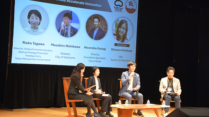 続くパネルディスカッション1では、スクエア・アップ・ニューヨーク代表取締役の梅原静香氏が総合司会を務め、田川理映子東京都スタートアップ戦略推進本部プロモーション推進部推進課長、西川勝裕横浜市米州事務所副所長、笠置淳信神戸市シリコンバレーオフィス・イノベーション専門官が、日米イノベーションの加速に向けた戦略について意見を交わした。パネルディスカッション2では、トヨタ・ベンチャーの創立者のジム・アドラー氏らが登壇した。そのあと、対日進出したスタートアップ企業主たちからの未来都市への提案に関する短時間のプレゼンテーションが行われ、最後は日米スタートアップ関係者を寿司でもてなす交流会が行われた。