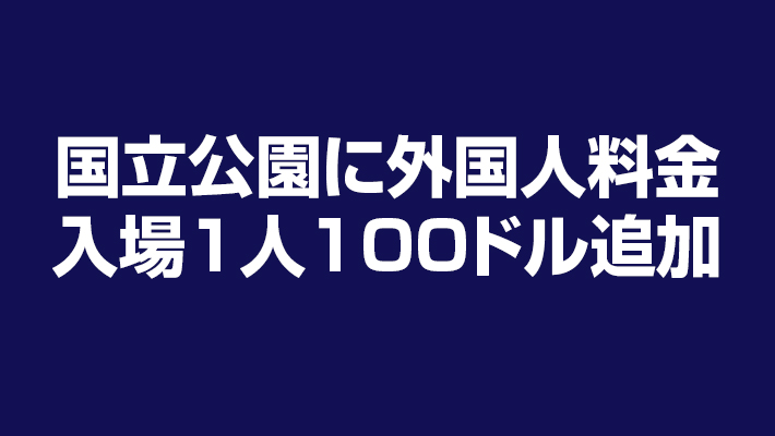 アメリカの国立公園を管轄する米国内務省は、訪問者数の多い国立公園11か所において外国人向け料金を施行した。今年1月1日から、対象の国立公園を訪れる外国人観光客は入園料に加えて、16歳以上の外国人(アメリカ非居住者)来園者ひとりあたり100ドルの追加料金が徴収される。追加料金は、国立公園の維持管理、施設の改修、サービス向上に充当されるという。対象となるのは、アーカディア国立公園、ブライスキャニオン国立公園、エバーグレーズ国立公園、グレイシャー国立公園、グランドキャニオン国立公園、グランドティトン国立公園、ロッキーマウンテン国立公園、セコイア・キングスキャニオン国立公園、イエローストーン国立公園、ヨセミテ国立公園、ザイオン国立公園。