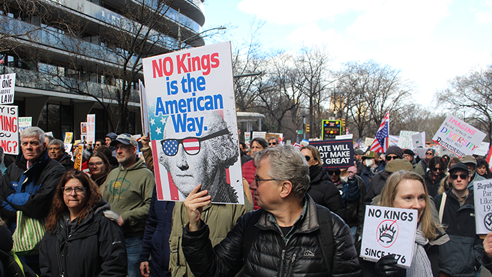 トランプ政権に抗議する「NO KING」の行進が3月28日マンハッタンでも行われ、セントラルパーク・サウスから7番街をタイムズスクエアに向けて大勢の人がプラカードを掲げて行進し7番街を埋め尽くした。姉弟で参加したマンハッタンに住むクレッグ・ライビーさんと、コネチカットから駆け付けたシャーロン・ライビーさん。トランプ大統領の熱狂的支持層による政治運動「Make America Great Again(MAGA)」をもじって「MAKING AMERICA WORSE」のプラカード。「トランプ大統領が、オバマ元大統領夫妻を類人猿に描いた人種差別的な動画を投稿したので、トランプを豚にしてやったわ」とシャーロンさん。ヨランダ・ガリンスカさんは「戦争に反対、今の政治に不満、家でじっとしていられなくて参加した。多くの人が参加するべき」。「ALEXA CHANGE THE PRESDENT」のプラカードを掲げた人も「テレビのスイッチをON&OFFするように、大統領も変えられたらいいのに」と語った。(石黒かおる、写真も)