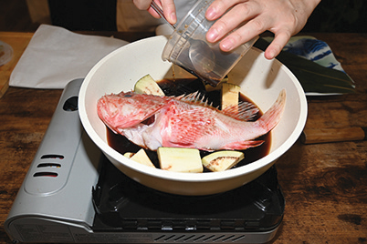 下処理として魚はお湯に潜ら浅めの鍋、もしくはフライパンに煮付け汁をいれて、魚をいれます。強火ににして、落とし蓋をします。煮詰めの時に汁がかかっていない魚の部分があればスプーンなどでかけてあげます。