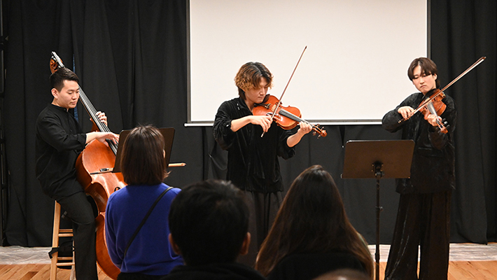 バイオリンの加藤光貴、宮川清一郎、サポートメンバーのコントラバス奏者・杉本望海(NY在住)がビバルディの夏、ハンガリアンダンス、ミッション・インポッシブルなど7曲を演奏した。