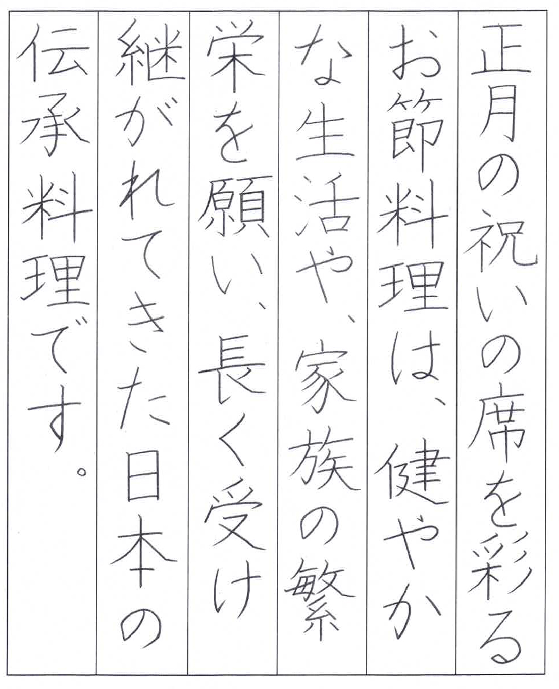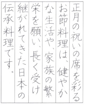 手本に従い一点一画を正確に書く、文字中心を揃える、最後まで集中して書くこと。