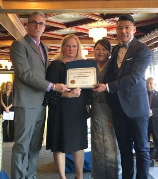 マウント・フジ・レストランの50周年を祝う式典は19日正午から絶景の眺めを堪能できる同レストラン結婚披露宴会場に350人の招待客を集めて盛大に行われた。中垣顕實法師による開会の祈りで創業者の藤田徳明、一枝夫妻の遺影に全員で黙祷を捧げたあと、地元ヒルバーン市のジョゼフ・トルシ市長とバーナデット・タランティーノ副市長の祝辞、ロックランド郡役員のエド・デイ氏、徳明氏との米国での長年の友人を代表して古本不動産社長の古本武司さんが次々と挨拶、レストラン事務所を統括するジム・ヤノ氏、事務所長のアンドレア・スミスさんがそれぞれ祝辞を述べた。