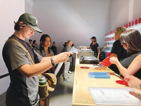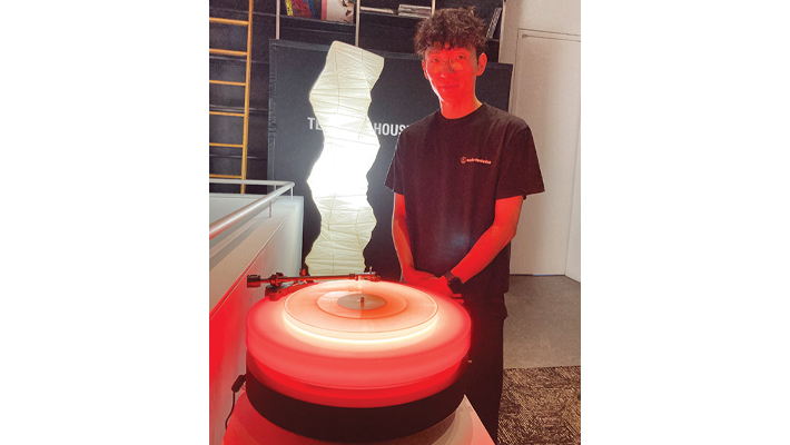 株式会社オーディオテクニカ商品戦略部で同商品を3年がかりで開発した1人、村上勇馬さん=写真上=によると、同ターンテーブルの特徴は3つ。1つは同社としては初の試みとなるスピーカー一体型のオールインワン形式を取ったこと、2つ目は強力な磁力の反発が生み出す、ターンテーブルを宙に浮かせる特殊構造。「この浮遊構造が内外の振動をアイソレーションし、カートリッジの再生精度を最大化させます。見た目にもインパクトのある機構が、空間に広がる精緻かつ力強いサウンドを実現します」と説明する。3つ目は、選んだ音楽と、20種類のカラーパレットから生まれる光が反応し、調和する美しいターンテーブルの発光システム。それはまさに、夜空に光を放つ蛍のような幻想的な空間を生み出し、視覚と聴覚で音楽に没入する体験を与えてくれる。価格は9999ドル。既に予約を受け付けており、今年10月から順次デリバリーが始まるという。当日は、つくばいの音を表現した茶室の静寂さを演出した音響ライブを音源としたレコード盤プレスのデモンストレーションも行われ、一枚一枚来場者にプレゼントされた=写真下=。両日あわせ約900人の招待客が来場した。詳細はhttps://audio-technica-hotaru.com/